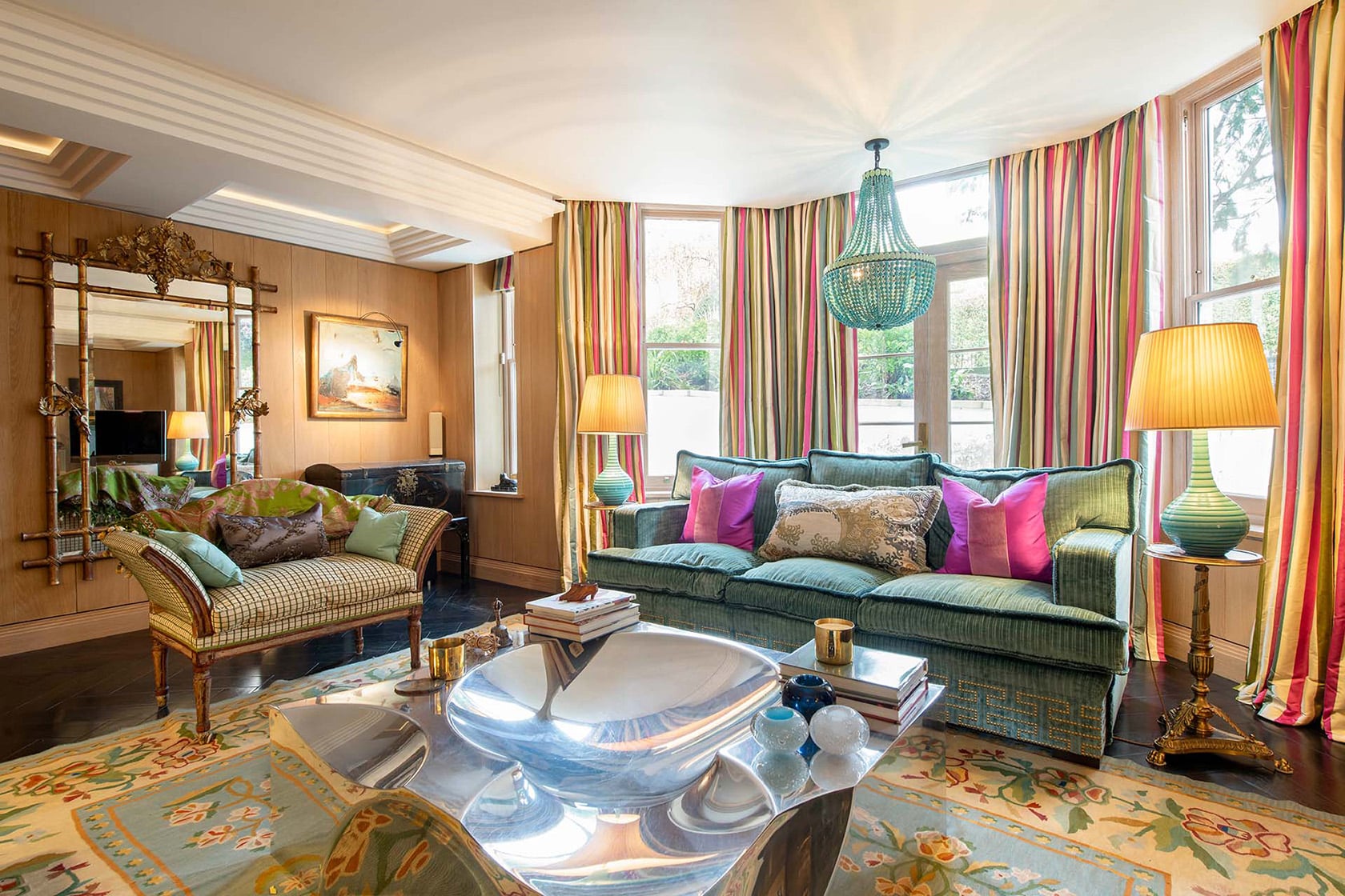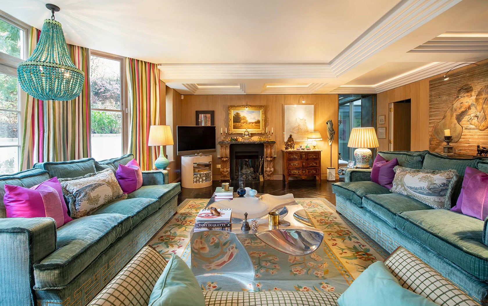 Having long admired Lucy’s work, Madelyn was eager to hear more about her approach to design and the thinking behind the many distinctive choices throughout Phillimore. “I’ve always been the queen of non-beige,” Lucy stated, a philosophy that is so beautifully on display in the living room. Rather than following trends, the space was shaped around a single, much-loved piece: an antique Arabian rug whose rich, layered colors became the starting point for the entire design.