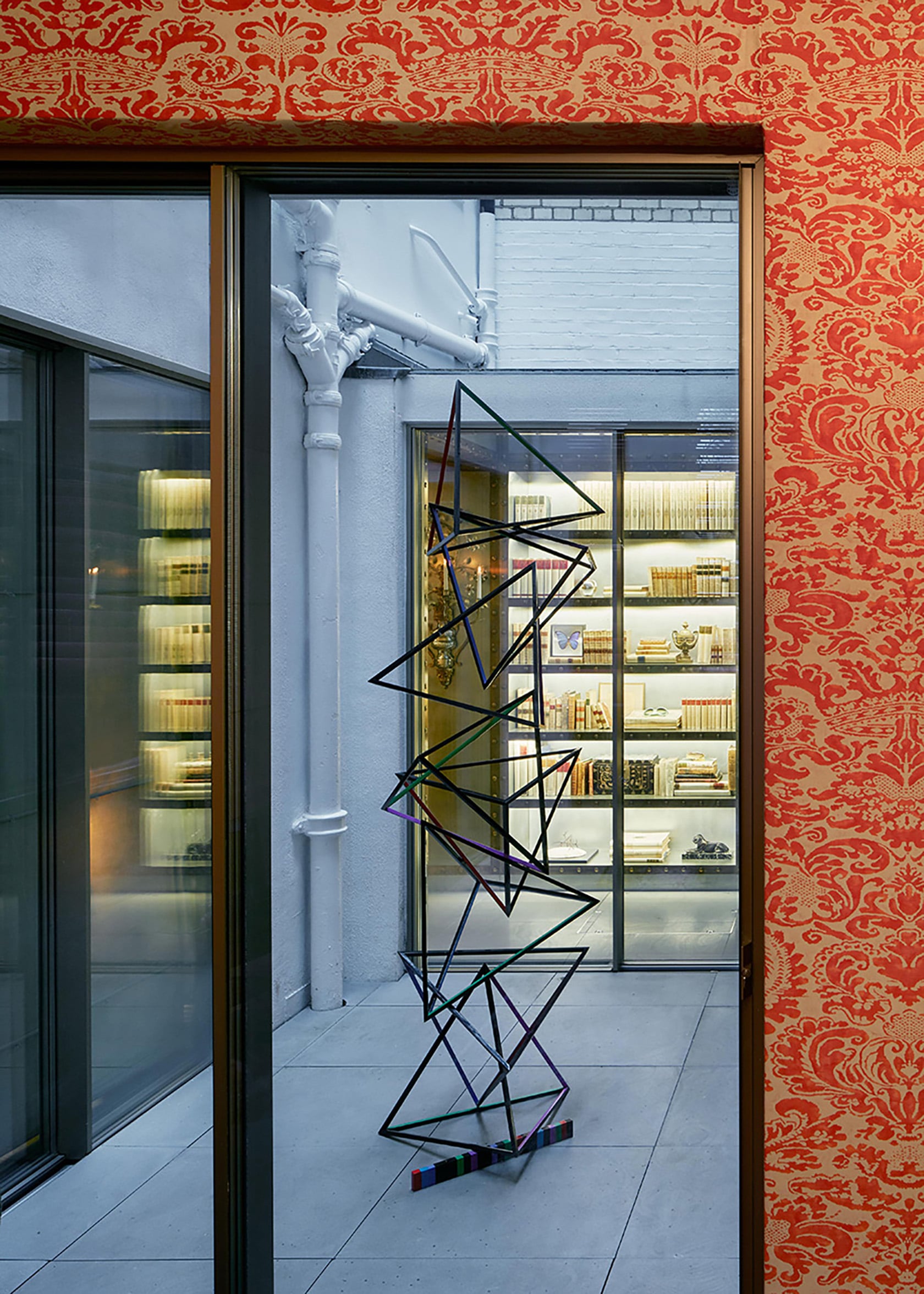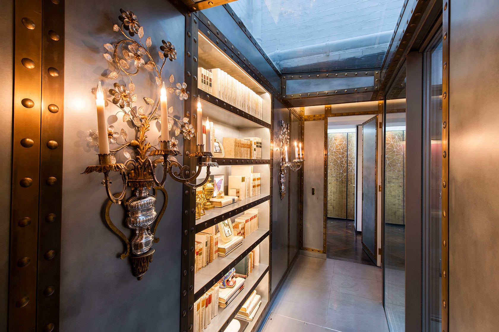Shelving, artwork and carefully placed antique wall sconces make the atrium feel as thoughtfully designed as the rest of the home. Brass detailing inspired by antique travel cases and traditional shipbuilding, with its riveted metalwork, sits alongside ornate sconces, creating a beautiful interplay between craftsmanship and whimsy.