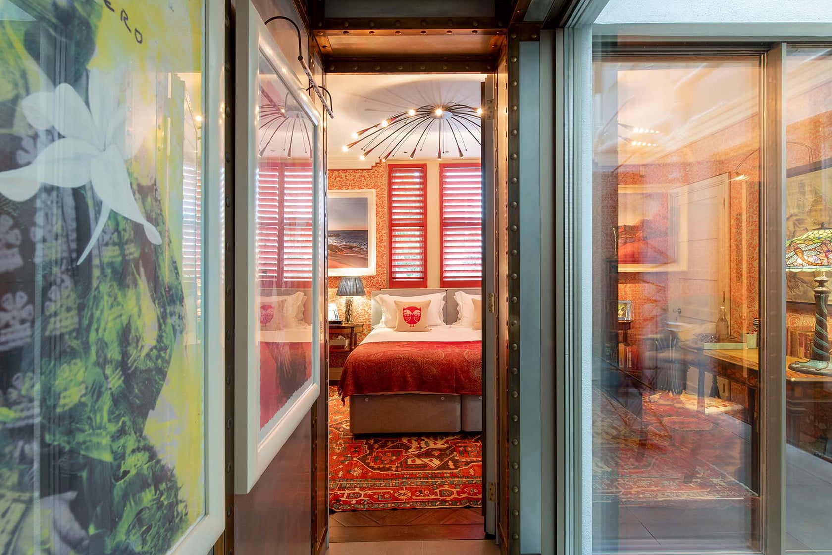 Even the details surprise and delight. Wooden shutters block out the light for restful sleep, but they’re lined in red suede – an unexpected choice that adds warmth and a touch of drama. It’s a detail that perfectly captures Lucy’s approach to design: original and unafraid.