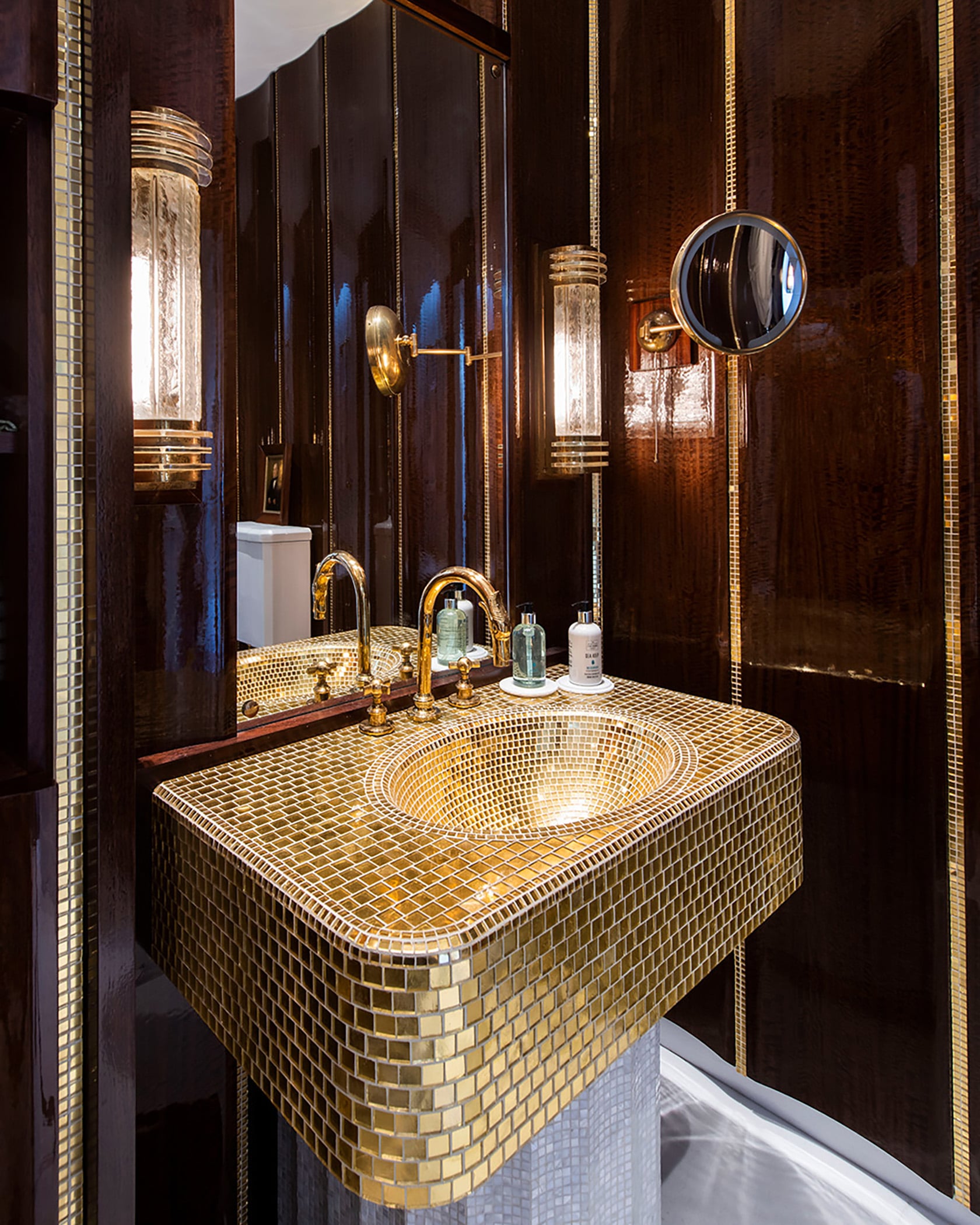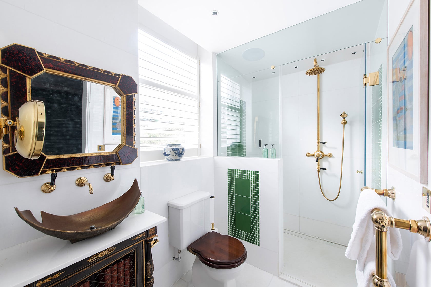 They sit alongside shimmering 24-carat gold mosaic tiles, while beautifully veined Greek marble and finely crafted concave wood wall panels bring balance and warmth to the space. A Drummonds brass radiator adds a timeless note, grounding the room in classic design, with every detail thoughtfully bespoke.