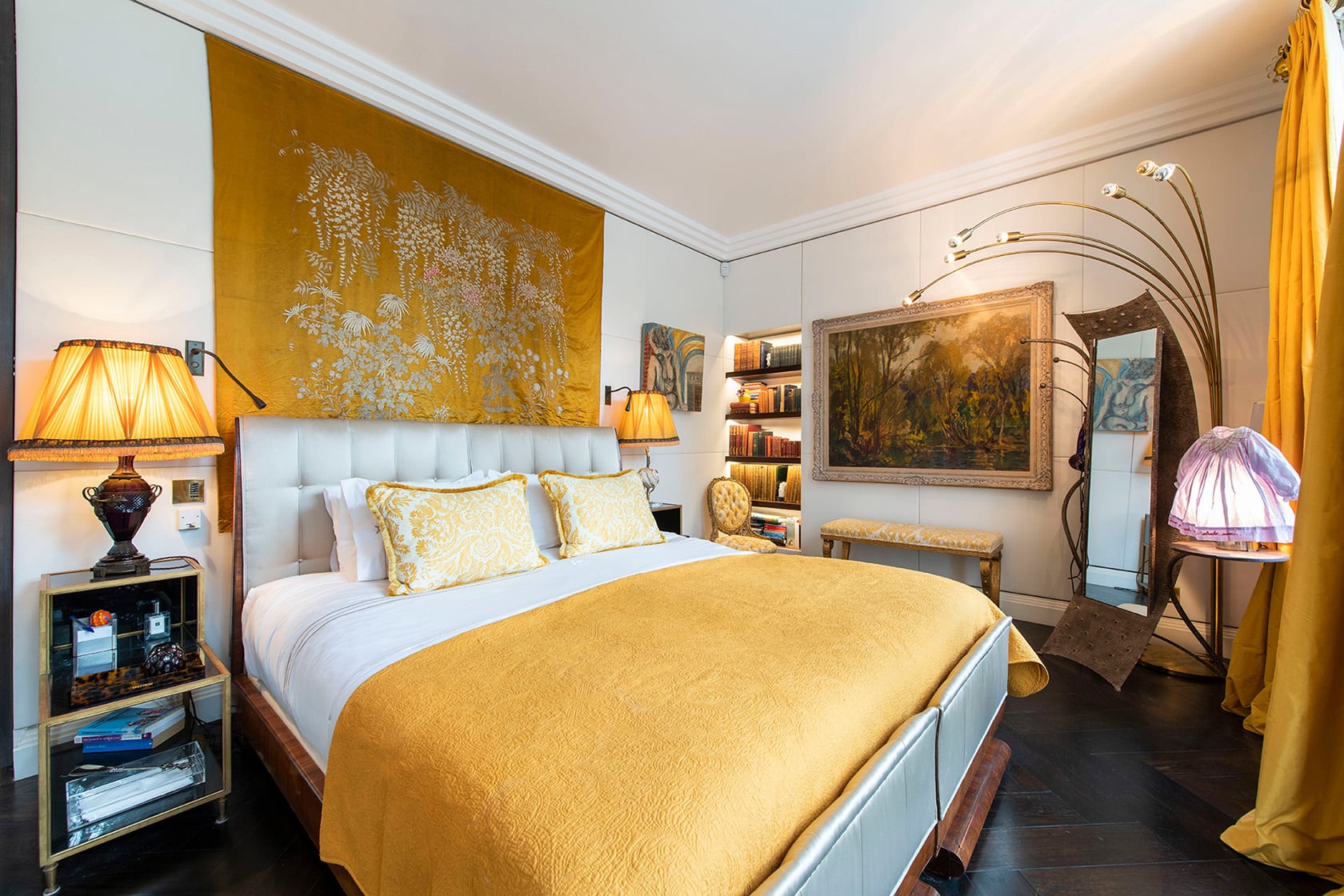 That sense of energy carries through the room as colors and textures play off one another. A beautiful rug grounds the space, while a Tiffany lamp on the desk picks up the warmth of the palette and adds a soft glow. Custom-made beds, crafted in England and topped with luxurious cashmere-filled mattresses, ensure that the room feels as inviting as it is visually striking. Now a full bedroom, the king bed can also be configured as twins, allowing the apartment to adapt easily to different stays.