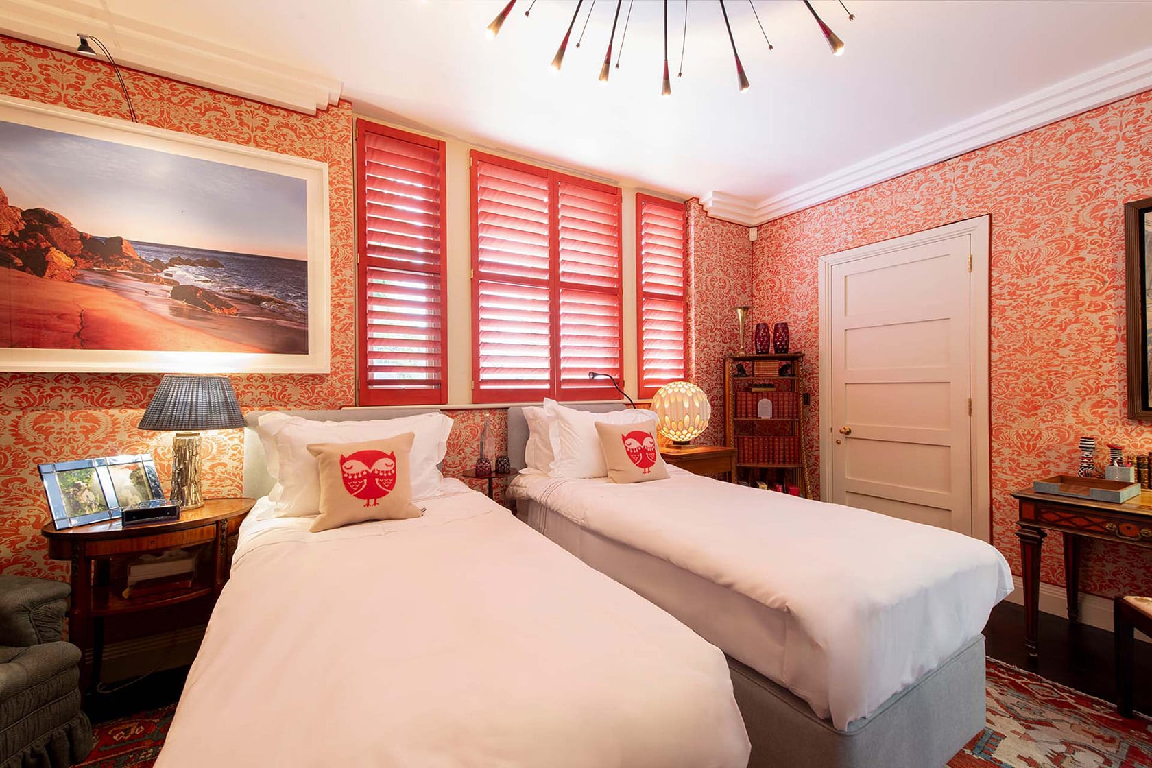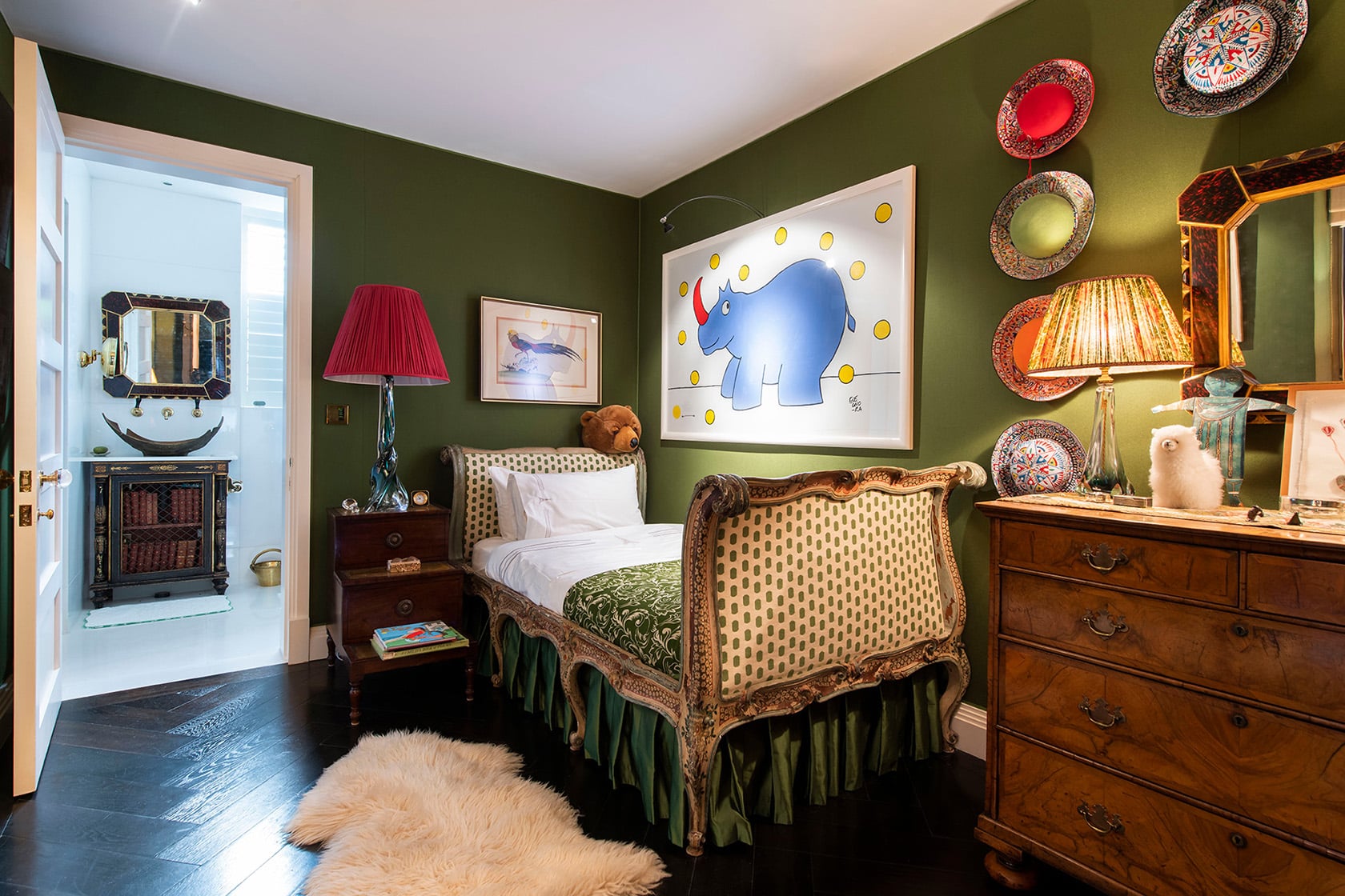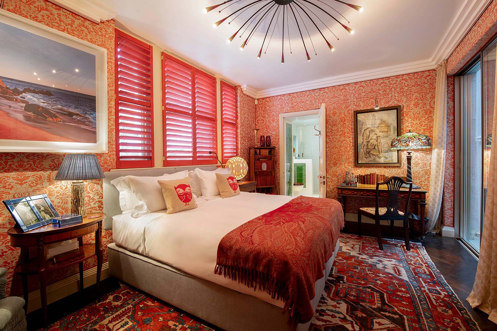 The second bedroom at Phillimore is where Lucy’s fearless use of color takes center stage. Warm and full of personality, it’s a space that feels instantly uplifting and is a stunning reminder that great design doesn’t have to play it safe.