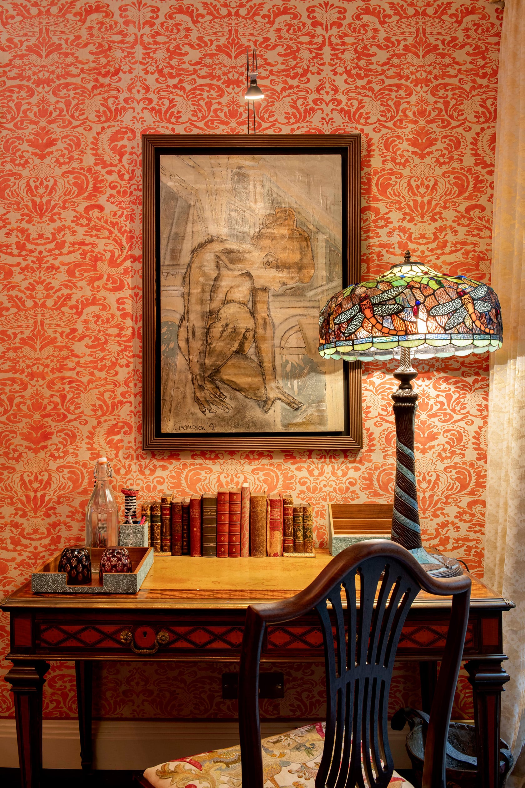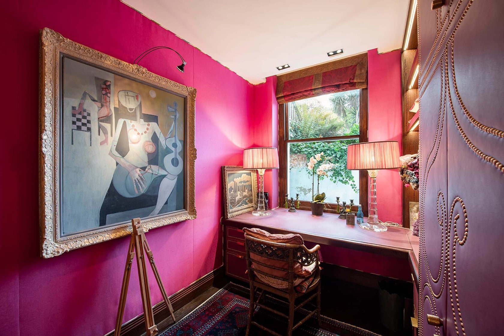 Lucy chose one of her favorite shades for the walls, a bold, expressive hue she calls lipstick. Wrapped in silk fabric and paired with chiffon-pink lampshades, the room feels intimate and uplifting all at once. An antique textile has been transformed into a Roman blind, while bespoke cabinetry with leather-studded detailing adds texture to the space.