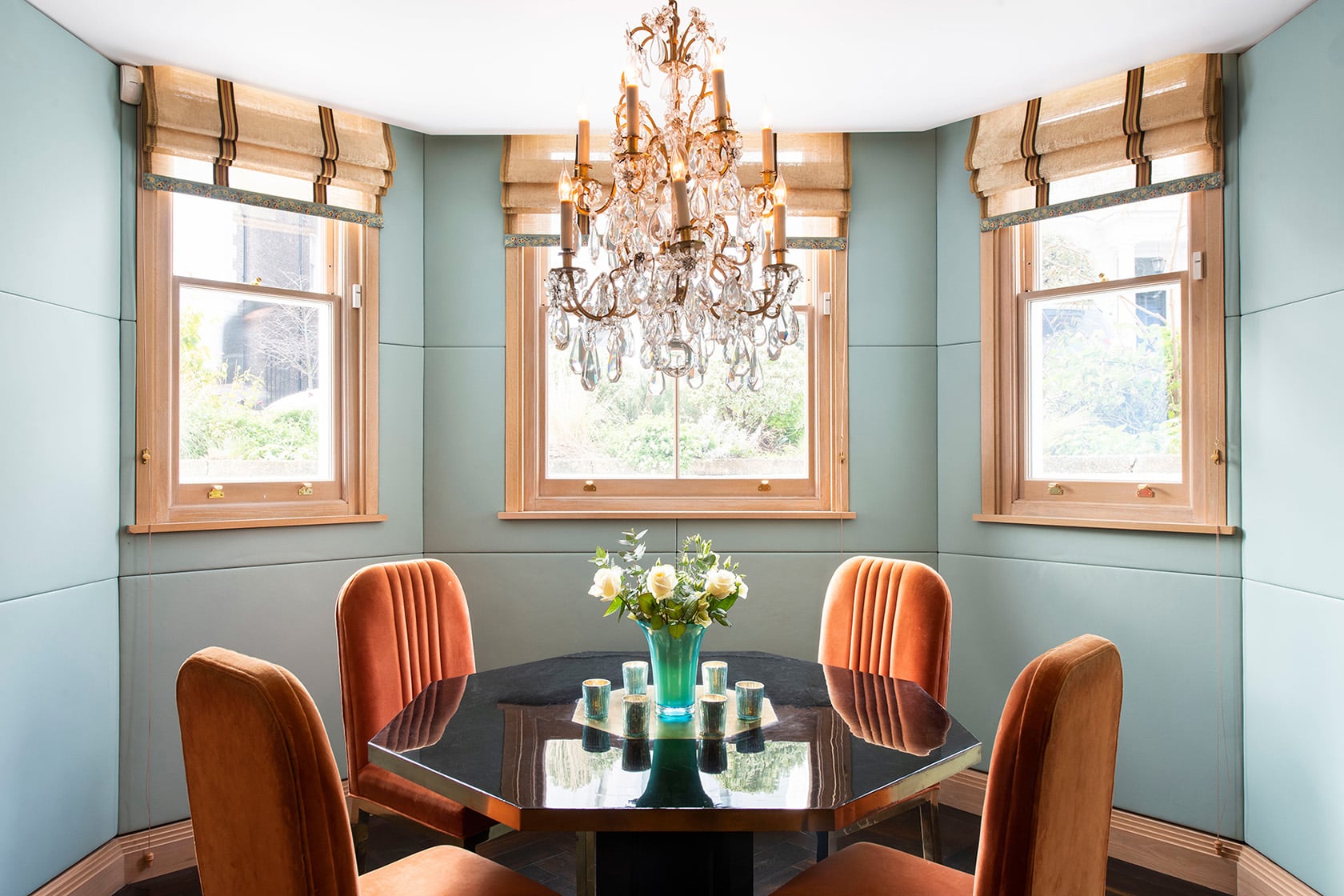Just beyond, the dining area is set into a bright bay of windows overlooking the front gardens, furnished with a beautiful table and vintage Pierre Cardin chairs upholstered in their original velvet. Thoughtfully lit and extremely comfortable, it’s a place designed as much for lingering over meals as for gathering while someone cooks – reinforcing Lucy’s belief that the best kitchens are meant to be lived in.