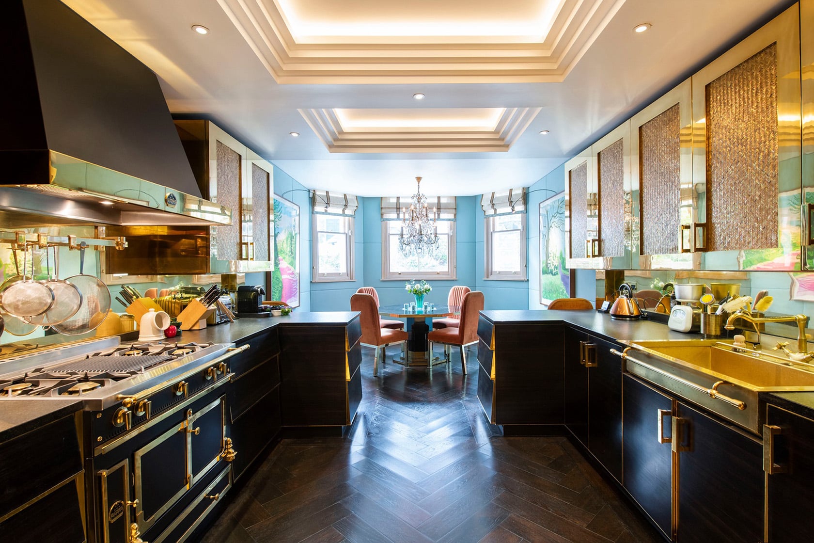 For Lucy, it all began with the woven brass basketweave panels in the upper cabinets, crafted in Indonesia, which set the tone for the kitchen’s distinctive use of brass. From there, Lucy drew on long-standing relationships with specialist makers and suppliers to create a kitchen that is entirely bespoke, from custom cabinetry and fittings to the antique French brass sink she sourced before designing the room around it. A La Cornue oven anchors the space, finished in deep tones to echo the ebony cabinetry and paired with black granite countertops chosen for both beauty and practicality.
