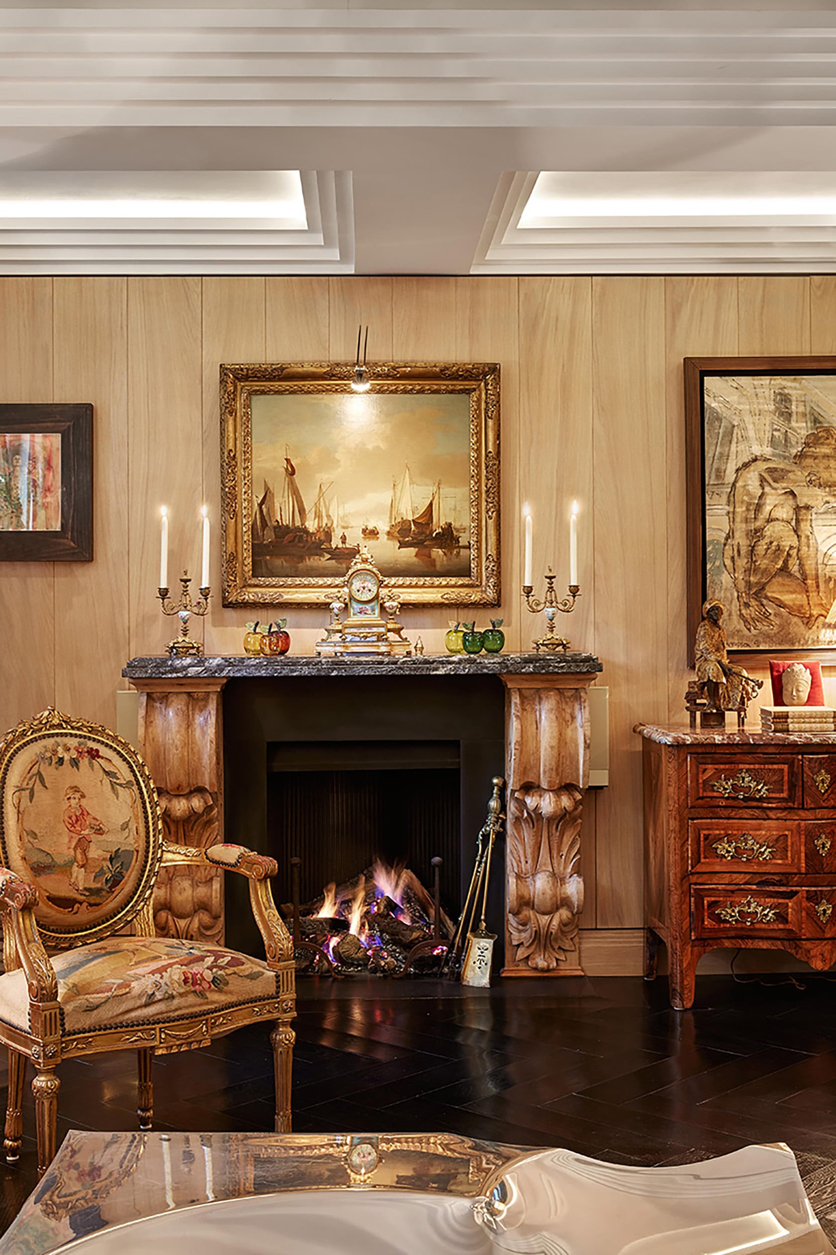Despite its artistry, this is a room meant to be lived in. Coffered lighting discreetly conceals modern infrastructure so nothing distracts from the atmosphere. As Lucy puts it simply, comfort is key, and here comfort and originality exist in perfect balance.