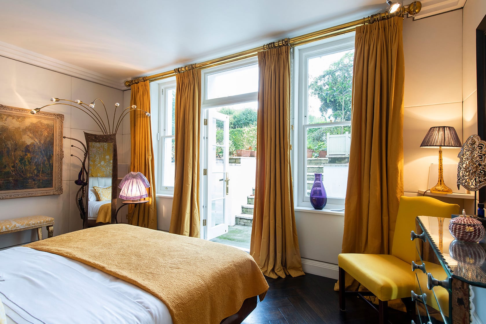 Layered materials and rich golds set the tone throughout the room. A French Art Deco wall light from the 1930s, discovered in a small antique shop in Kent, is featured in the dressing area and echoed by similar fixtures in the en suite bathroom. Gilded gesso cupboard doors, made using traditional techniques, add depth and texture, their hand-carved patterns subtly catching the light. Fully interlined silk curtains, hung from bespoke brass rods, complete the warm, enveloping feel of the space.